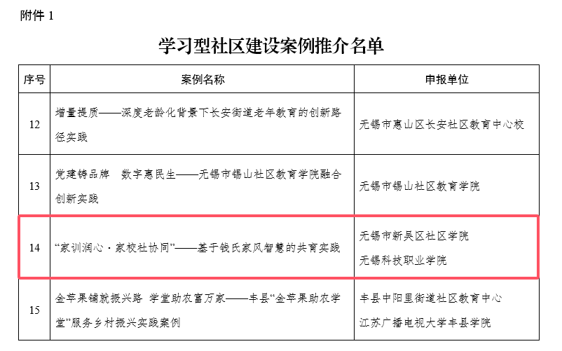 喜报:新吴区社区学院双项成果入选省级学习型社区建设推介名单近日,江苏省教育厅办公室依据《教育部办公厅关于征集数字赋能学习型社区建设典型案例和品牌课程的通知》(教职成厅函〔2025〕22号)要求,完成学习型社区建设案例与课程征集评选工作,正式推介119个符合规范、贴合居民需求的优秀实践案例及135门优质课程。新吴区社区学院携手无锡科技职业学院申报的实践案例《“家训润心・家校社协同”—— 基于钱氏家风智慧的共育...