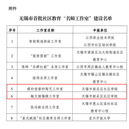 喜报:新吴区社区学院两个工作室入选无锡市首批社区教育“名师工作室”近日,无锡市社会教育服务指导中心发布《关于公布无锡市首批社区教育“名师工作室”建设名单的通知》锡社教指〔2025〕5号),正式公布首批立项建设的社区教育“名师工作室”名单。新吴区社区学院申报的“璞砂堂紫砂陶艺工作室”与“鲍文姬锡绣工作室”双双成功入选,在全市首批八个工作室中占据两席,这一佳绩充分展现了学院在社区教育特色化、品牌化建设道...