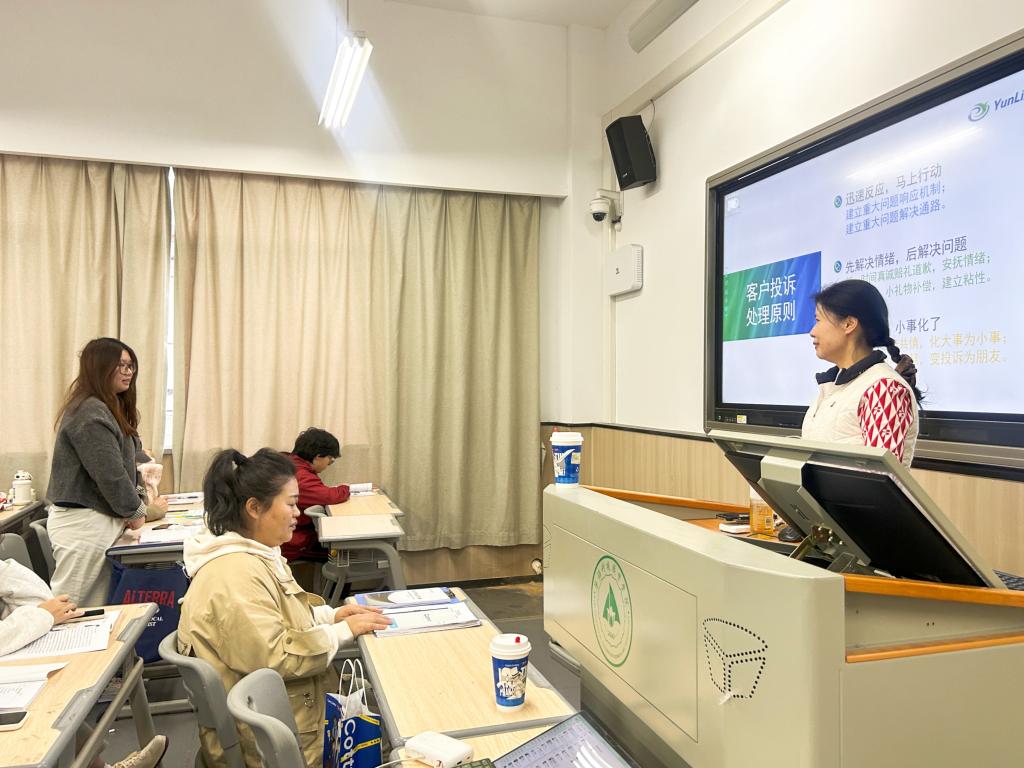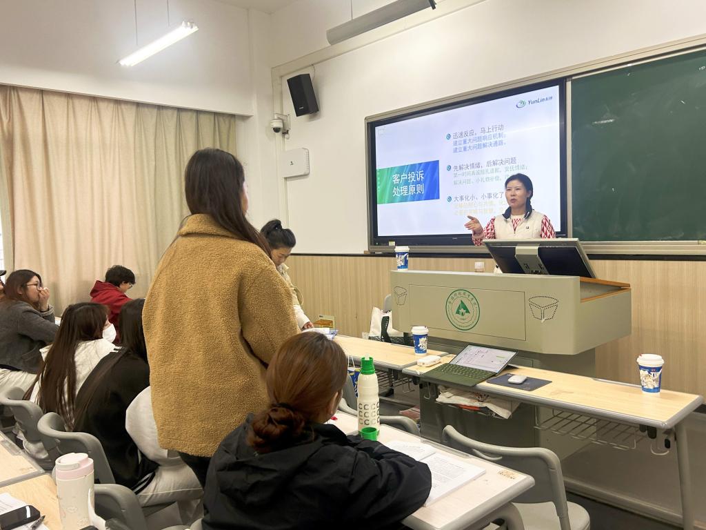 近日,我校文化旅游学院应用英语专业开展了一场别开生面的实践教学活动——邀请耘林企业客户服务部总监黄芳担任企业导师,走进课堂以真实客户投诉案例为切入点,为学生们带来了一堂生动的职场技能课。活动通过“案例复盘+角色扮演+互动答疑”的形式,将理论知识与实战经验紧密结合,助力学生提升客户服务意识与问题解决能力。