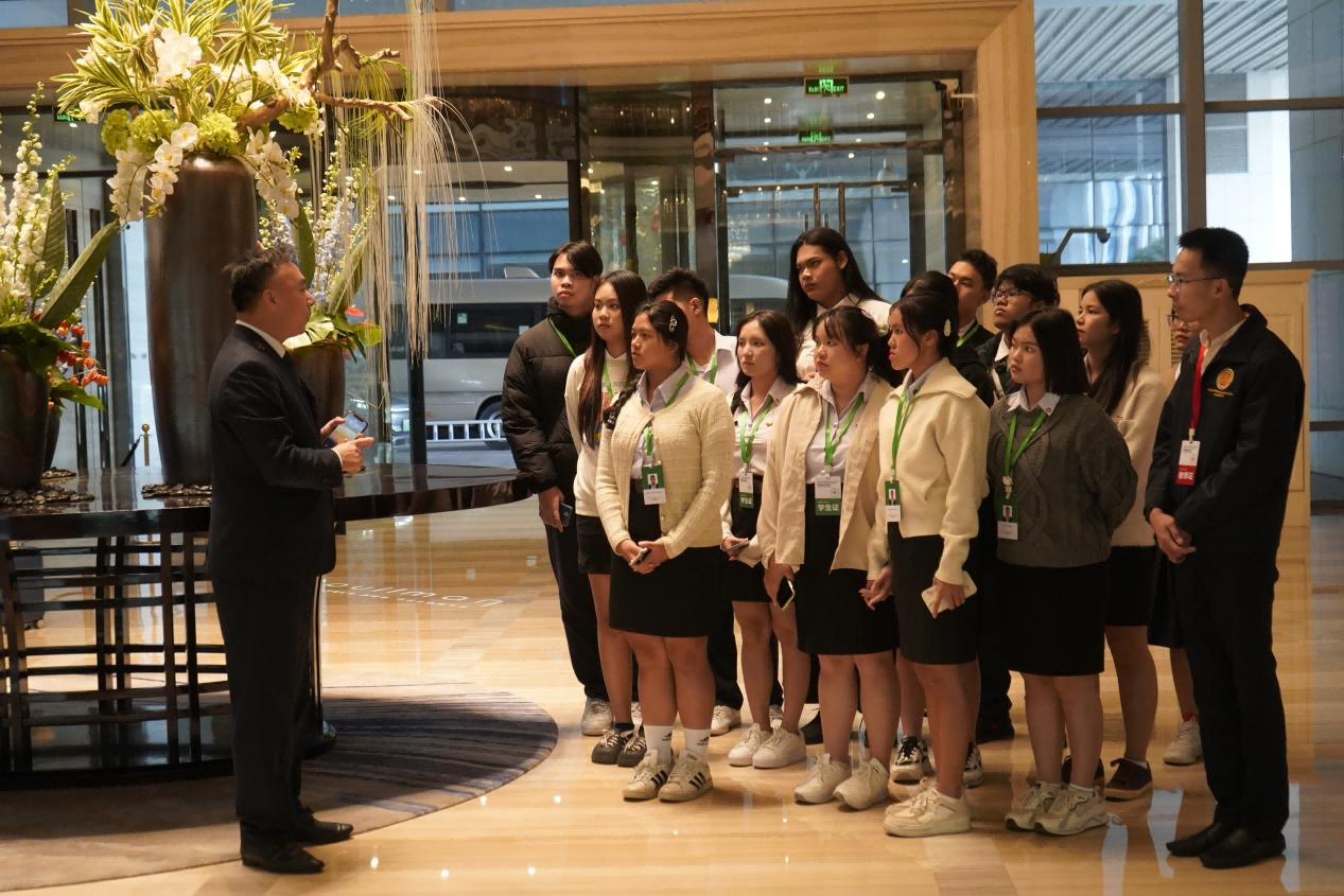 10月20日,留学生团组前往校企合作基地——无锡新湖铂尔曼大酒店开展企业研学活动。学生们深入酒店前厅、客房及餐饮等部门,直观感受了中国高端酒店业的运营标准与服务文化。该酒店作为我校深度合作企业,总经理于安先生受聘为酒管专业产业教授,企业导师深度参与课程教学与人才培养方案审定。此次研学不仅是课堂知识的延伸,更是我校近年来深耕“现代学徒制”改革、构建“资源共享、人才共育”机制成果的生动展示。特别值得一提的是,铂尔曼酒店的人才与文化发展总监陈晓倩女士进校参与留学生专业课程《酒店人力资源管理》的教学,得到泰国师生的一致好评。