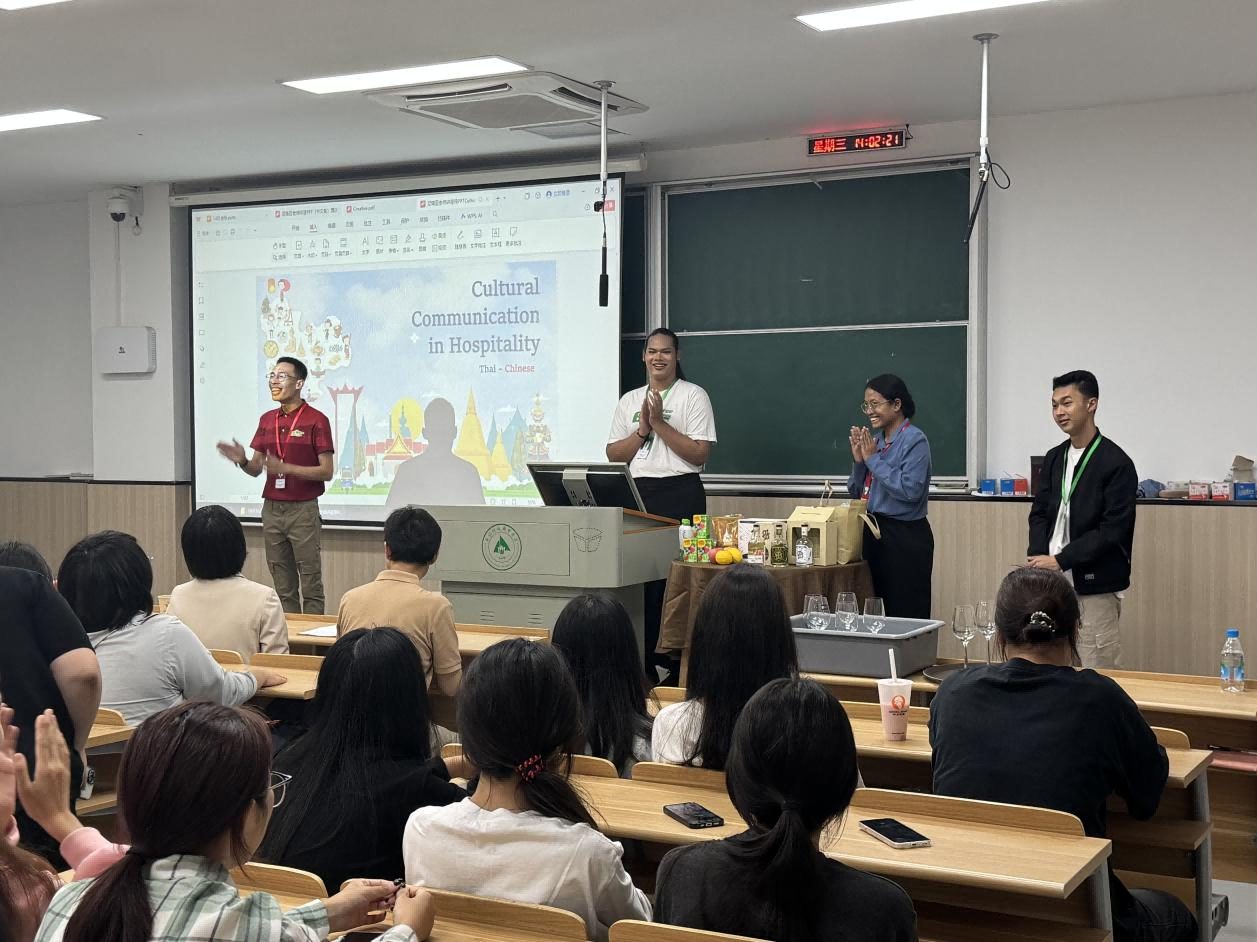 10月15日,泰方尼塔亚老师为我校师生带来了《跨文化沟通与酒店服务》专题讲座,深入阐释了泰国“微笑服务”的精髓。讲座中,中泰学生携手进行创意鸡尾酒制作,选用中泰两地特色食材,寓意着两校合作的融合与创新。10月29日,中泰学生专业交流活动精彩纷呈,双方学生通过PPT展示、自由讨论等交换专业学习心得和中泰文化,共同协作完成中餐摆台与礼仪展示,在专业实践与文化交流中深化了理解,缔结了友谊。
