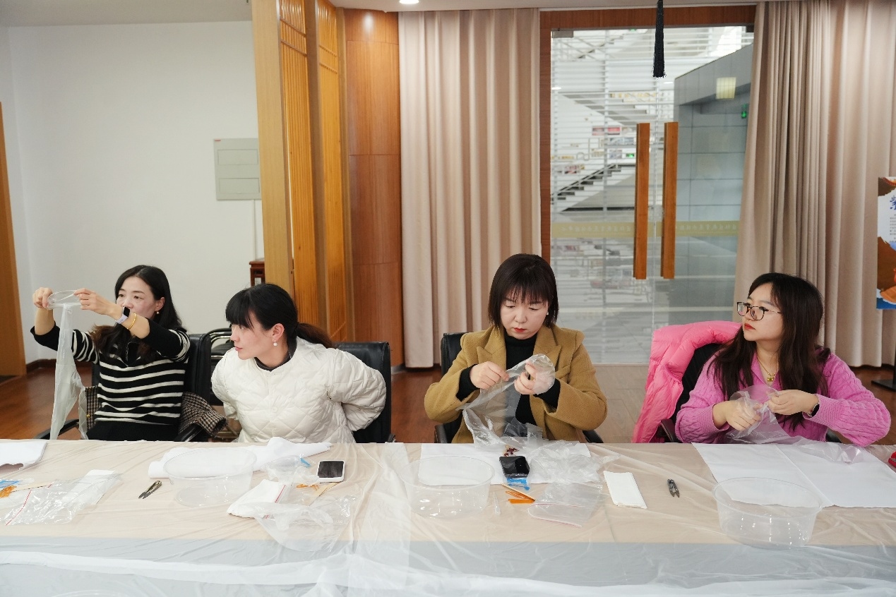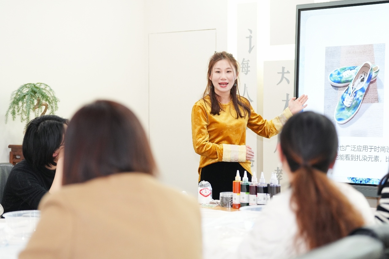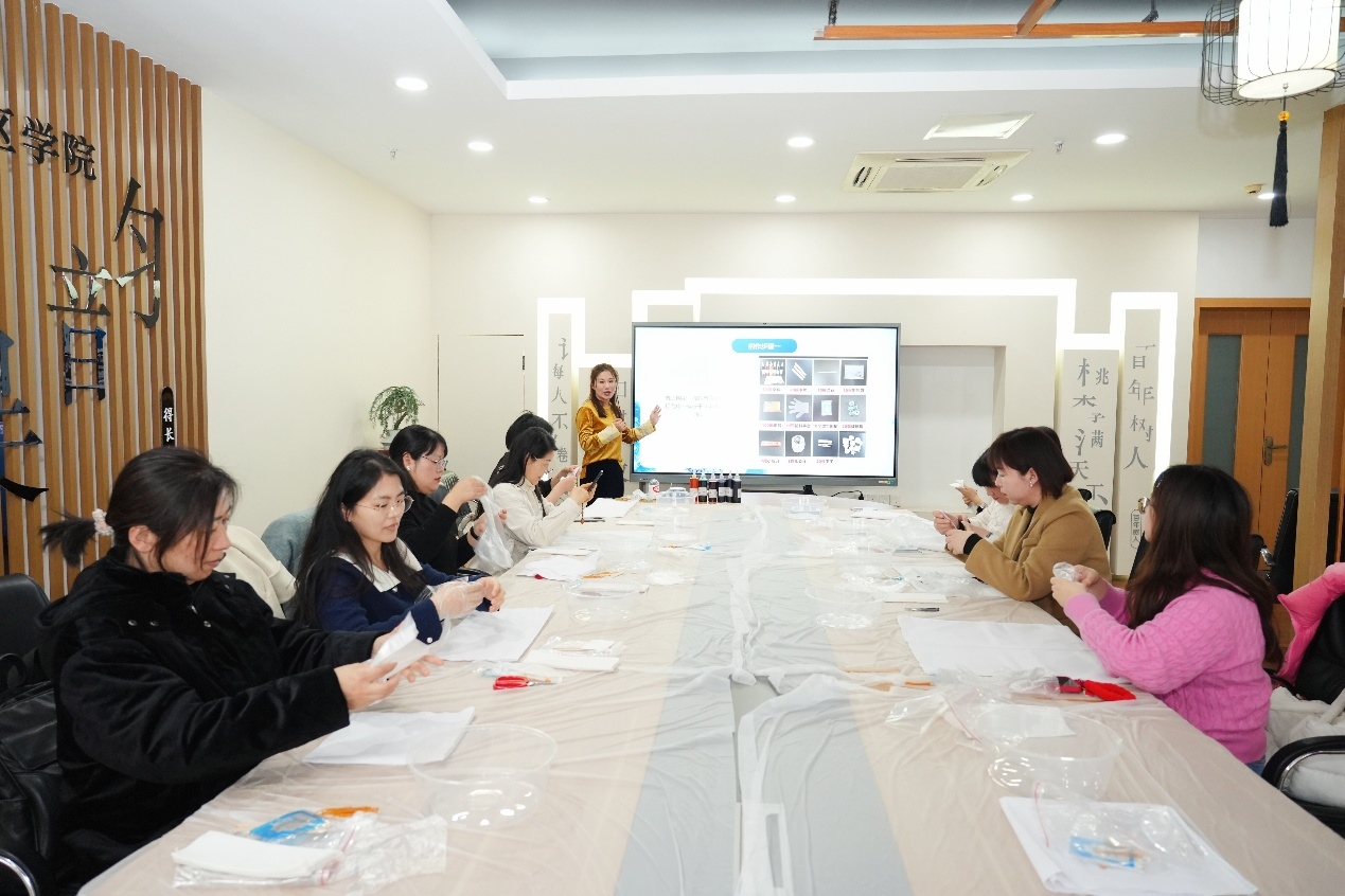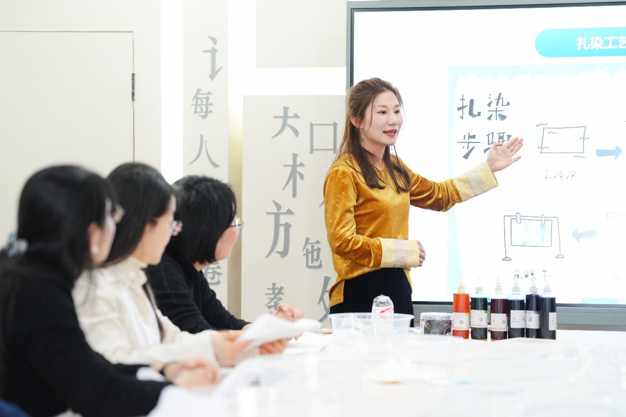 扎染课程指导老师表示:“能在三八节为各位教育工作者带来扎染体验,我觉得特别有意义。教育工作者平日里默默耕耘、辛勤付出,希望通过这样的非遗体验,让大家感受传统手工艺的乐趣,在动手创作中放松心情,也让更多人了解扎染、爱上扎染,让非遗文化融入日常。”