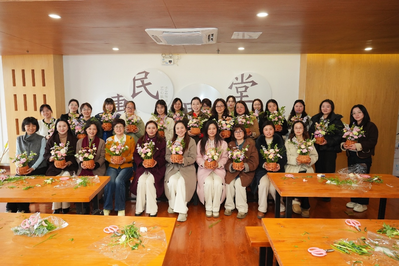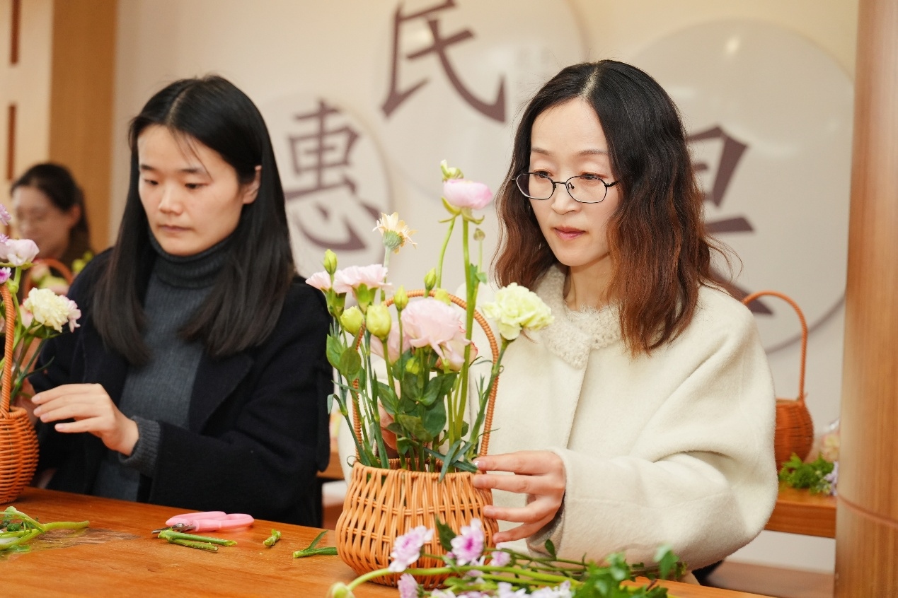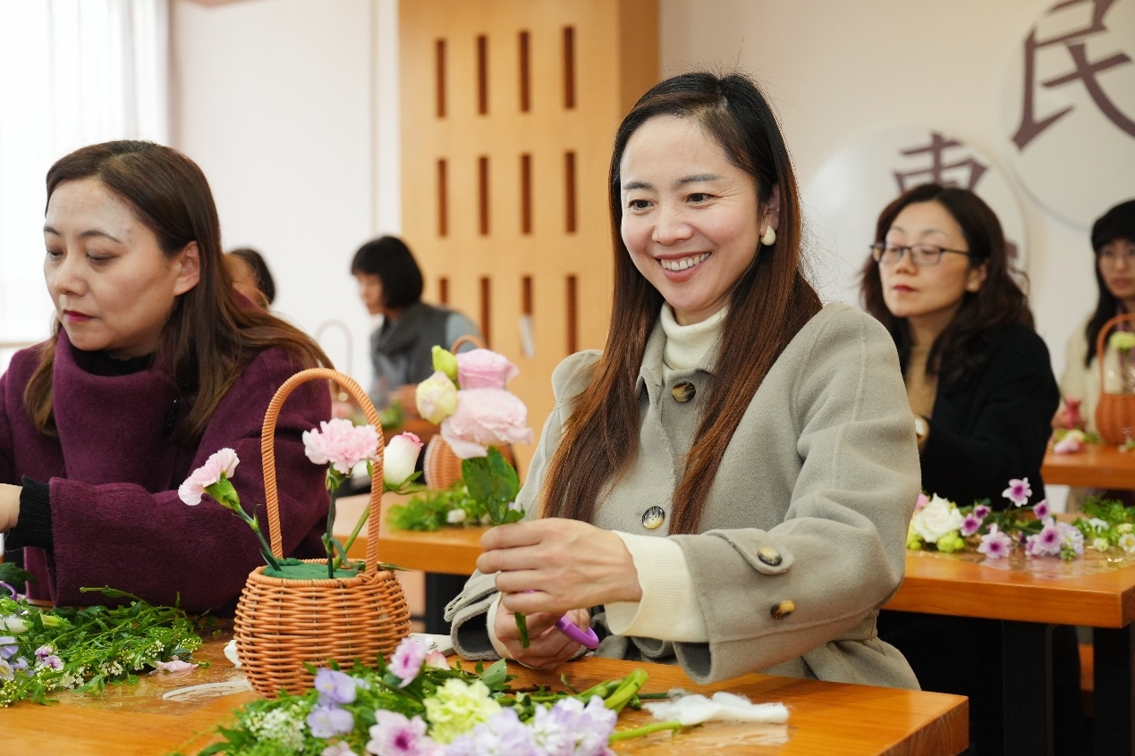插花区域内,鲜花芬芳四溢,玫瑰、洋桔梗、小雏菊等花材错落摆放,花艺老师从花材选择、色彩搭配、造型设计等方面娓娓道来,讲解插花的基本技巧和审美原则。大家认真聆听、潜心实践,修剪枝叶、搭配花材、调整造型,将春日的美好凝于花器之中,一件件错落有致、生机盎然的插花作品接连诞生,现场花香与欢声笑语交织。