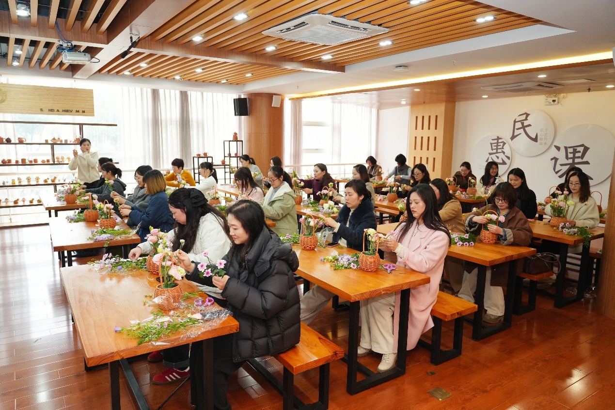 阳春三月,芳华绽放。在三八国际妇女节到来之际,无锡市新吴区社区学院以“雅韵润教坛 芳华绽新吴”为主题,精心策划开展扎染、漆扇、插花非遗体验活动,邀请辖区 52 位教育工作者齐聚一堂,在指尖创意与传统美学交融中,感受非遗文化魅力,共度温馨雅致的节日时光。活动特别邀请三位非遗技艺老师现场授课指导,让各位女教育工作者在忙碌的教学工作之余,卸下疲惫、陶冶情操,在传统手工艺的体验中邂逅美好。